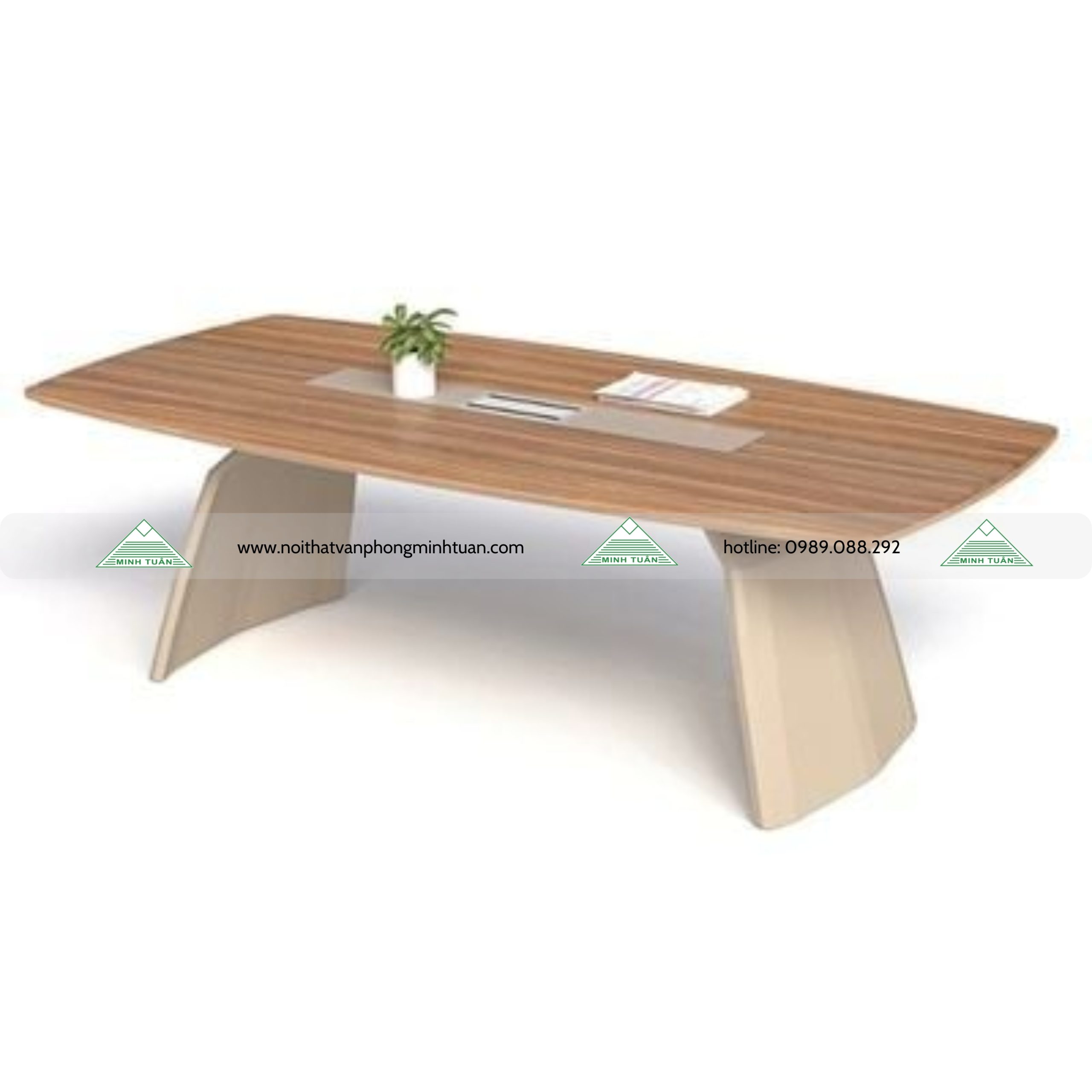 Bàn họp 2.4m, chân bằng thép hộp tạo hình cánh quạt sơn tĩnh điện màu vàng cát, thanh giằng thép hộp. Mặt bàn gỗ MFC 2 lớp, lớp trên dày 17mm, lớp dưới dày 17mm cạnh vát chéo kèm 1 nắp nhôm lật 2 chiều.