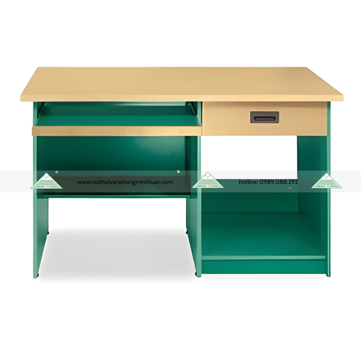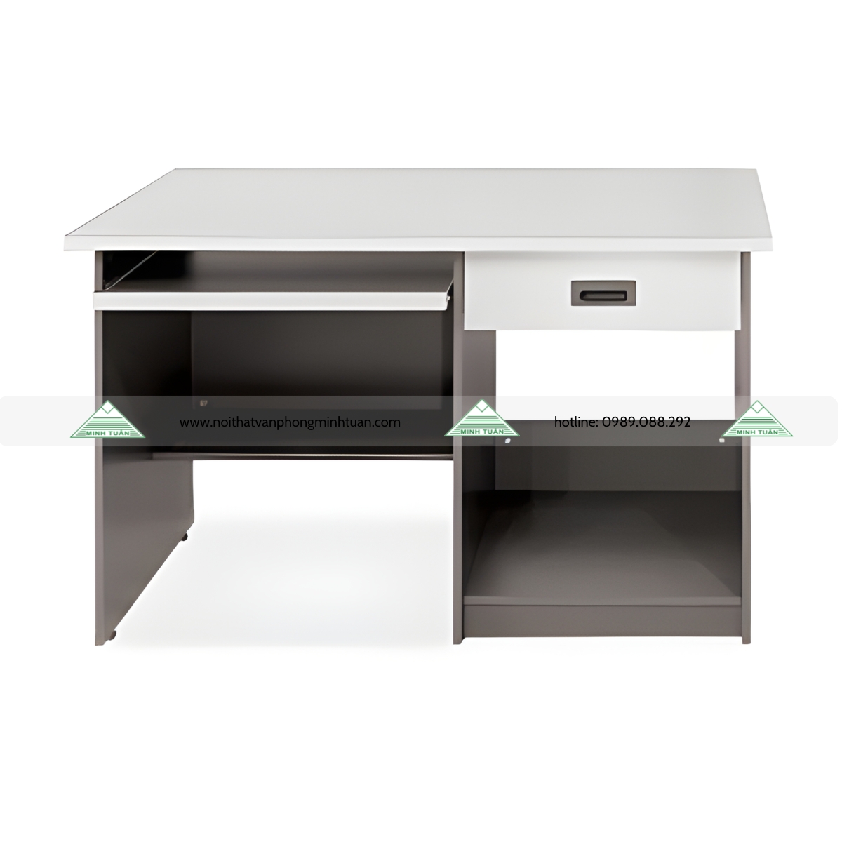 - Bàn vi tính gỗ MFC trong bảng màu. Mặt dày 25, chân dày 17mm. Có 1 ngăn kéo và 1 khay bàn phím.
