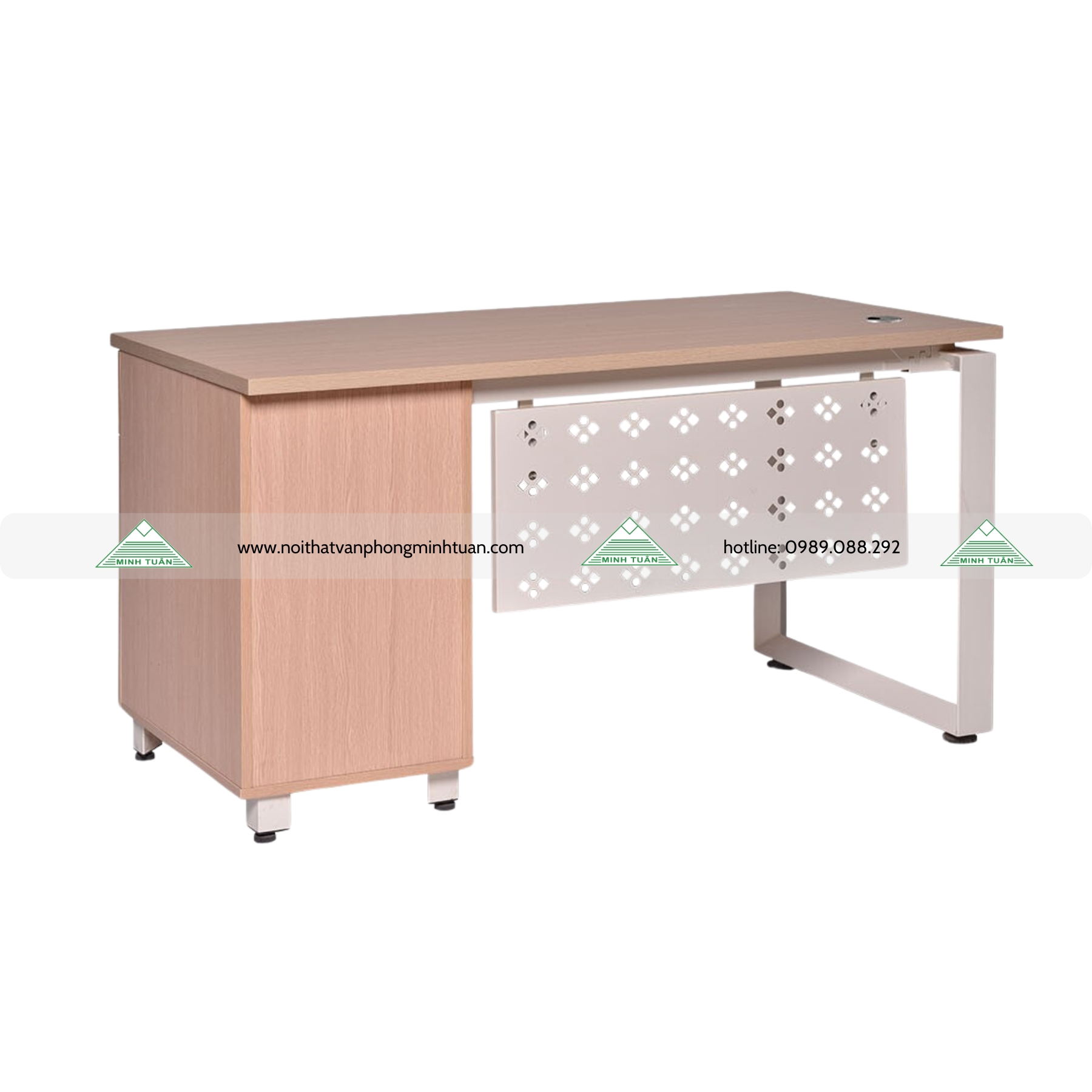 - Bàn làm việc mặt gỗ melamine khung thép tam giác có hộc liền 1 ngăn kéo và 1 cánh mở.