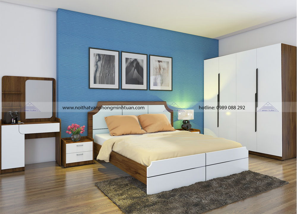 - Một bộ bao gồm giường, tap đầu giường, tủ áo 4 cánh, bàn phấn.