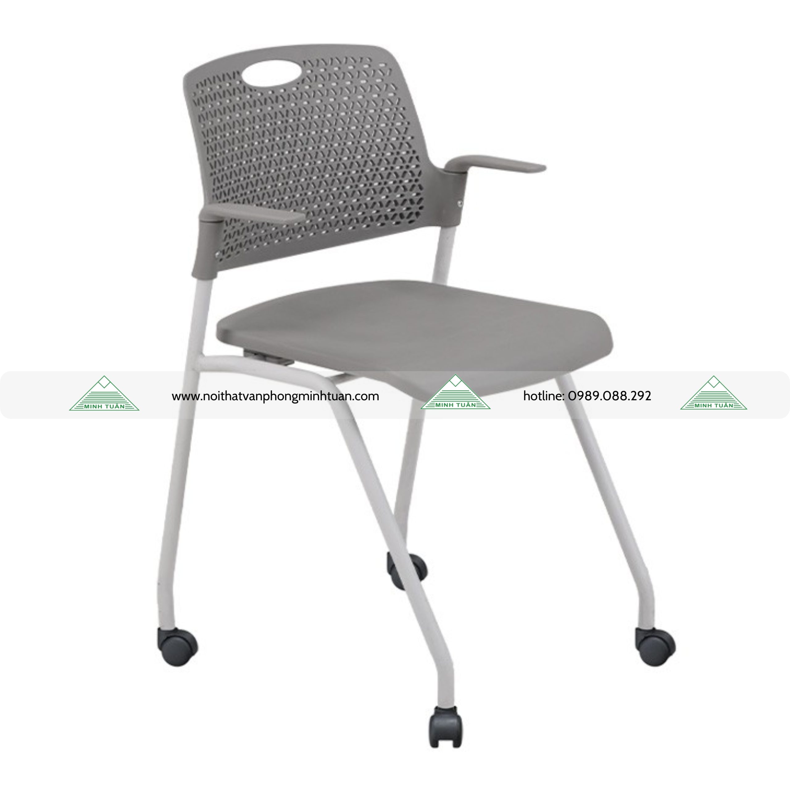 • Ghế hội trường, đệm tựa + tay ghế nhựa đồng màu. Ghế có thể xếp lồng lại với nhau theo hàng. Chân ghế bằng thép có bánh xe di chuyển.