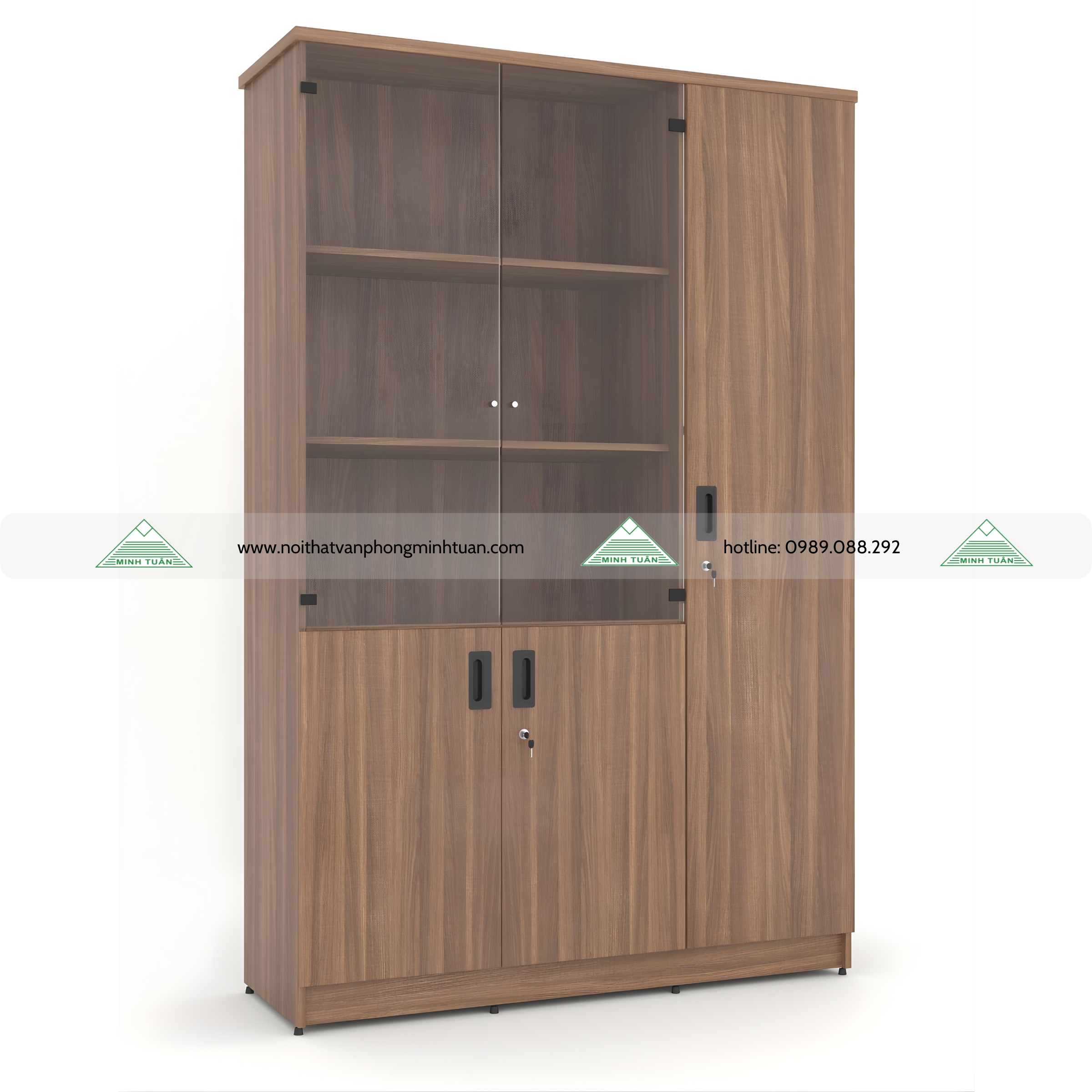 - Tủ gỗ MFC 3 khoang, khoanh kính trên 2 đợt không khóa, khoang dưới cánh gỗ 1 đợt, khoang phụ 3 đợt.