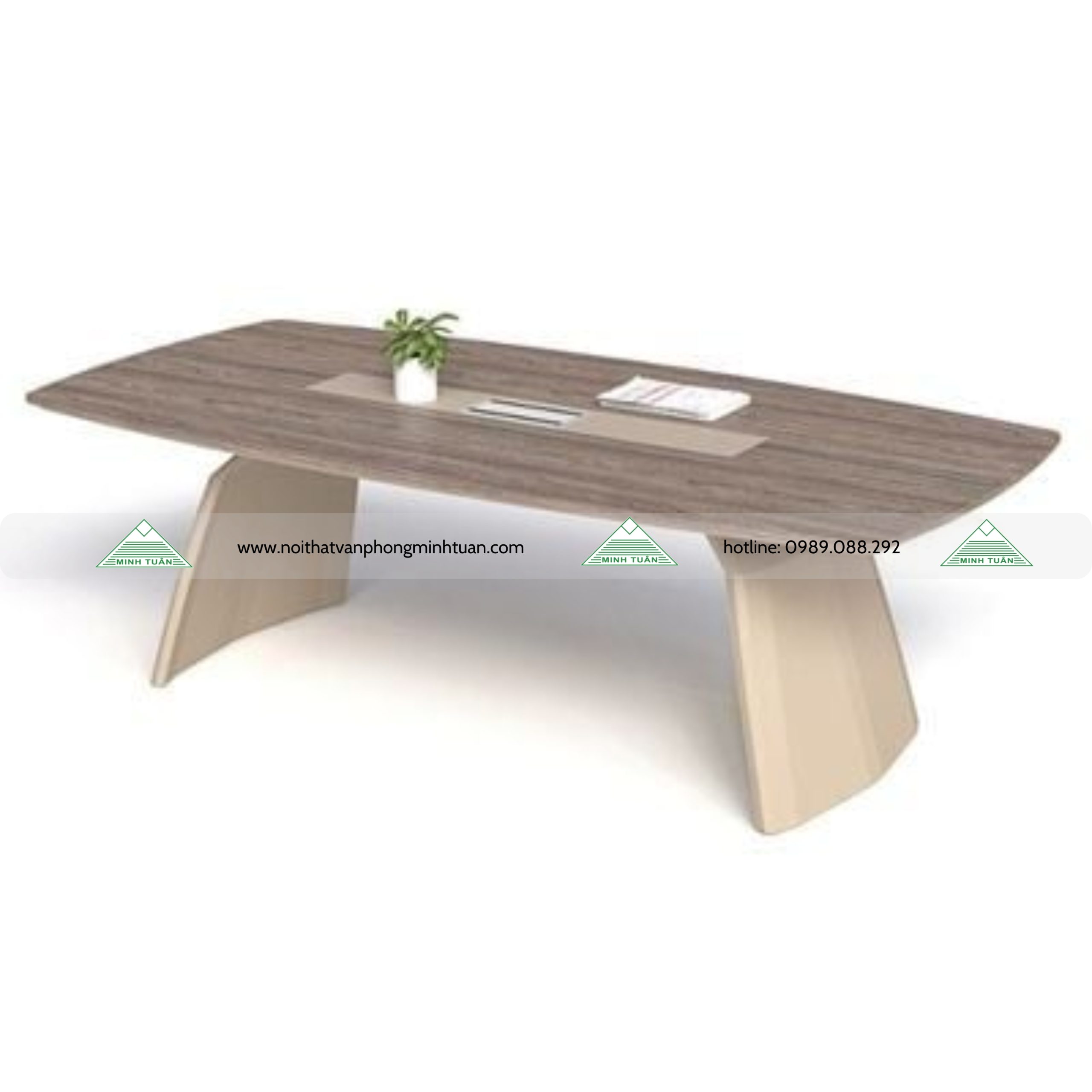 Bàn họp 2.4m, chân bằng thép hộp tạo hình cánh quạt sơn tĩnh điện màu vàng cát, thanh giằng thép hộp. Mặt bàn gỗ MFC 2 lớp, lớp trên dày 17mm, lớp dưới dày 17mm cạnh vát chéo kèm 1 nắp nhôm lật 2 chiều.