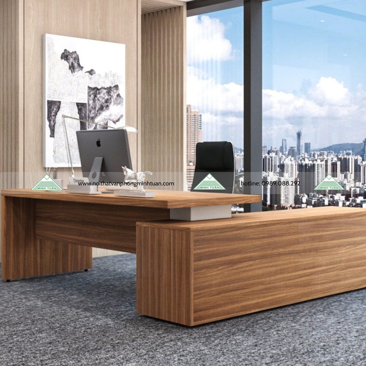 - Bàn giám đốc có 1 tủ phụ liền (2 khoang cánh mở, 1 khoang 3 ngăn kéo, 1 khoang để CPU. Gỗ MFC. Mặt và chân dày 50mm. Yếm dày 25mm.
