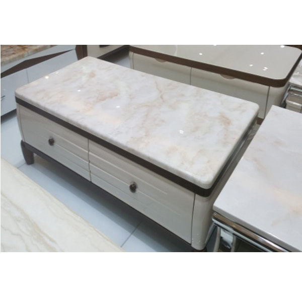 Bàn uống trà khung gỗ công nghiệp sơn phủ trắng bóng cao cấp, mặt đá sáng.