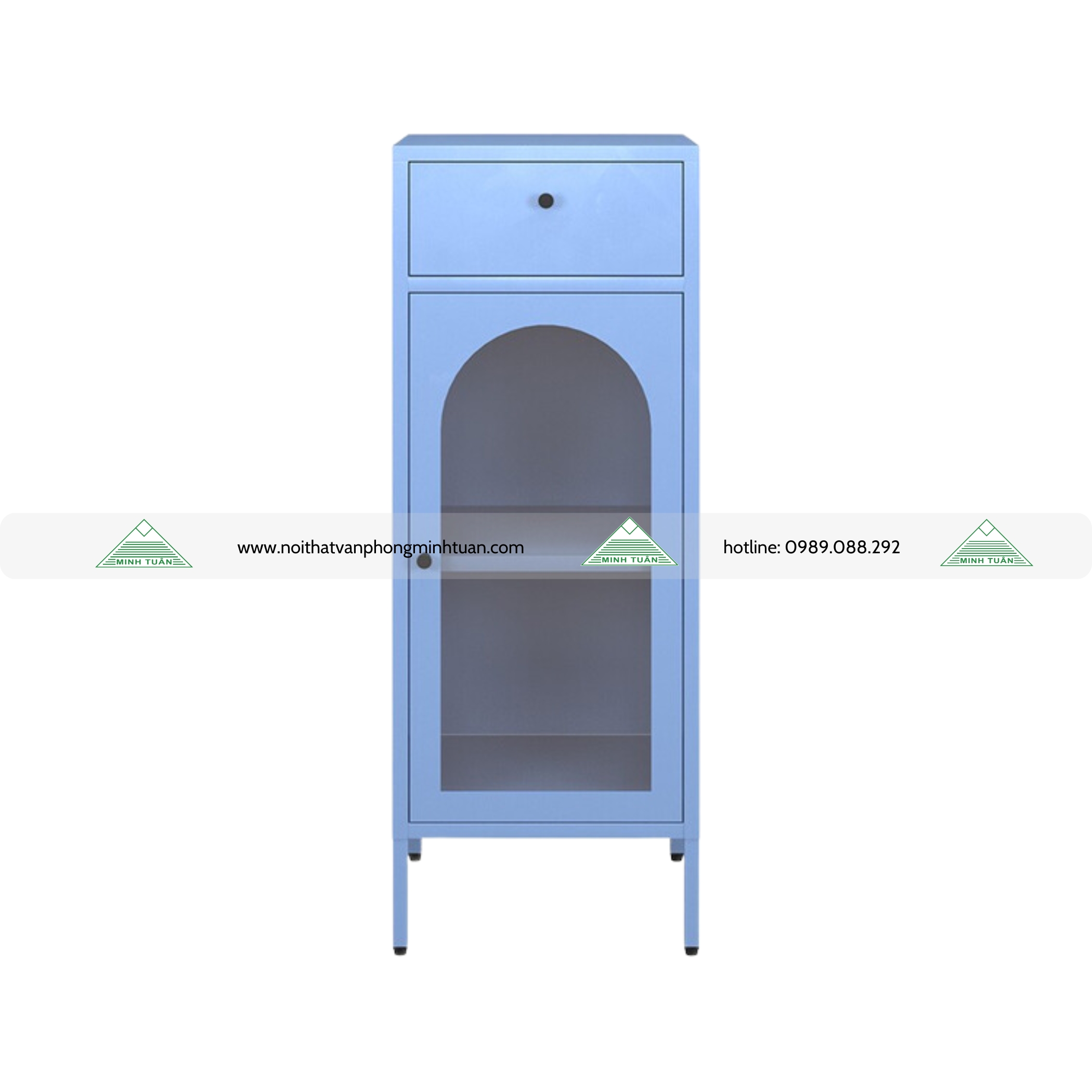 • Tủ sắt để đồ gia dụng gồm 1 ngăn kéo phía trên và 1 khoang kính mở phía dưới, bên trong có 1 đợt di động.