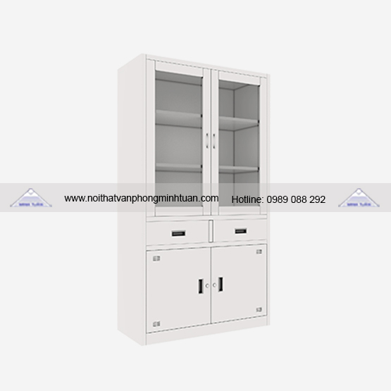 Tủ gồm 2 khoang: Khoang trên có 02 cánh kính mở sử dụng chung 1 khóa, phía trong bao gồm 02 đợt di động.