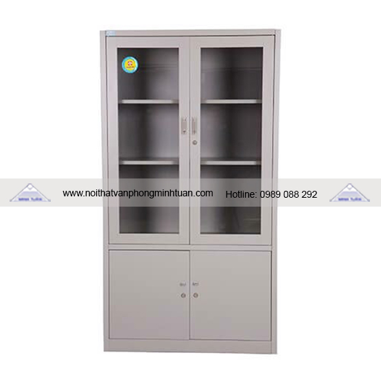 Tủ hồ sơ gồm 02 khoang: Ngăn trên có 02 cánh kính mở khóa đơn, và 02 đợt di dộng giúp lưu trữ tài liệu linh hoạt.