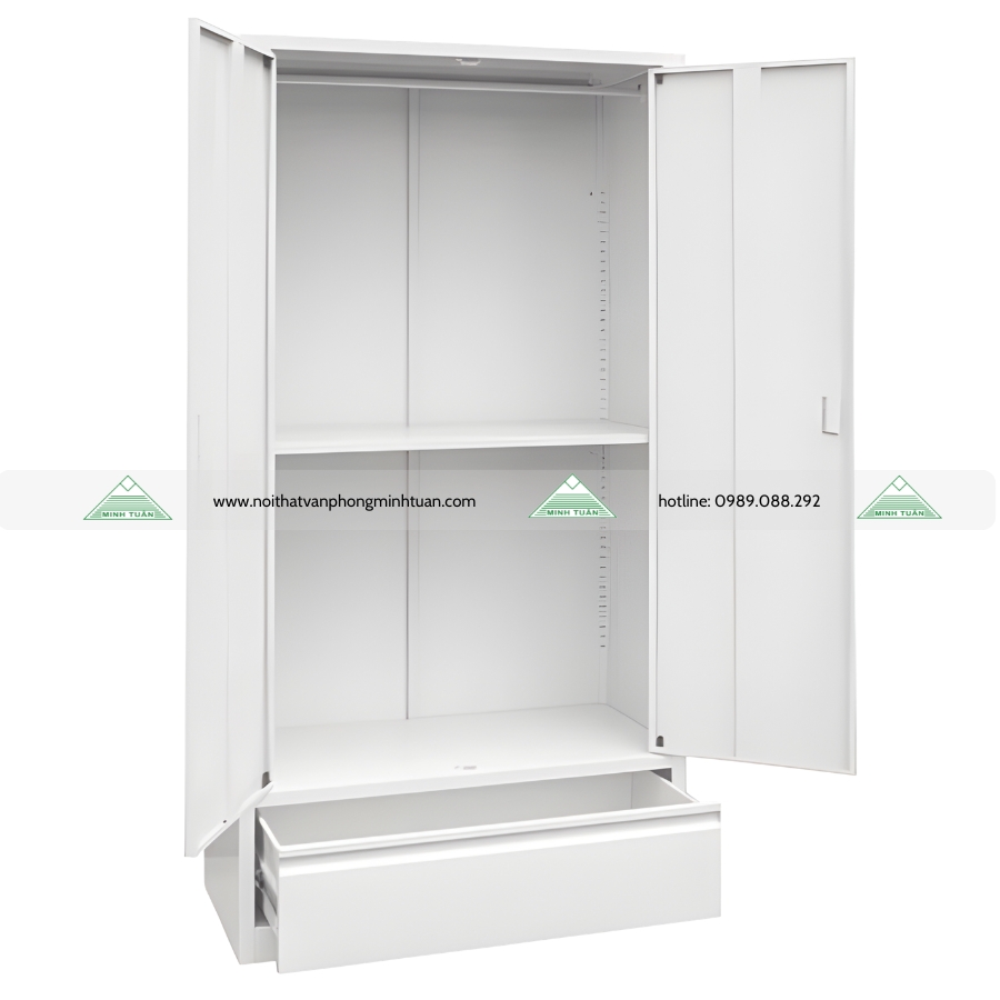 - Tủ sắt TSA2 thuộc dòng tủ sắt 1 trụ, 1 khối, có treo quần áo cứng cáp, ngăn kéo bên dưới, không khóa đến từ thương hiệu Nội thất 190.