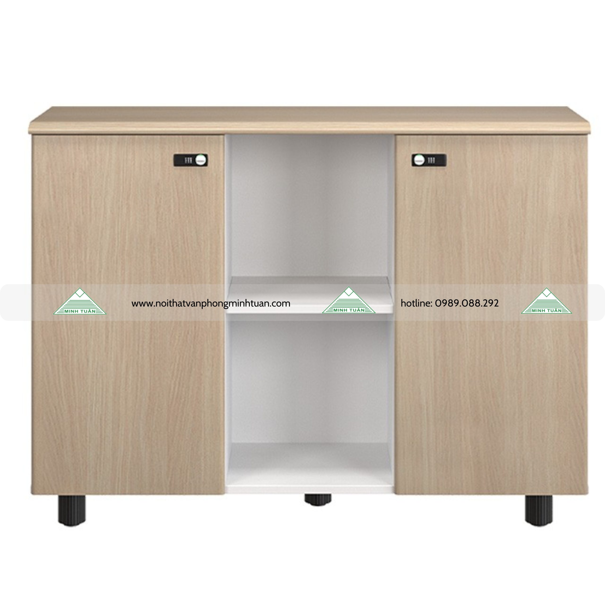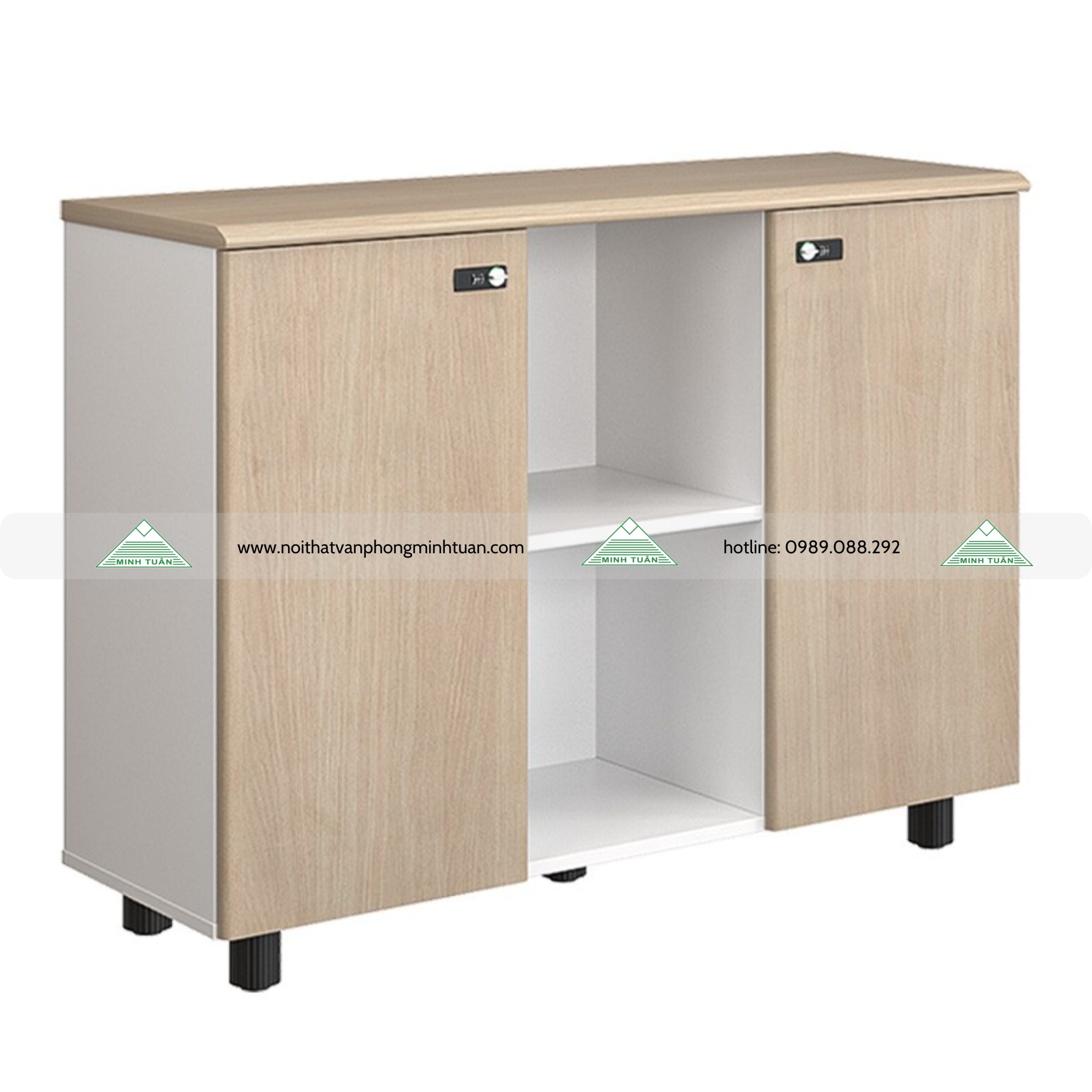 • Tủ thấp NTV880-3T1 chất liệu Laminate kết hợp melamine, gồm 2 cánh dài và 1 khoang trống để tài liệu hoặc decor.